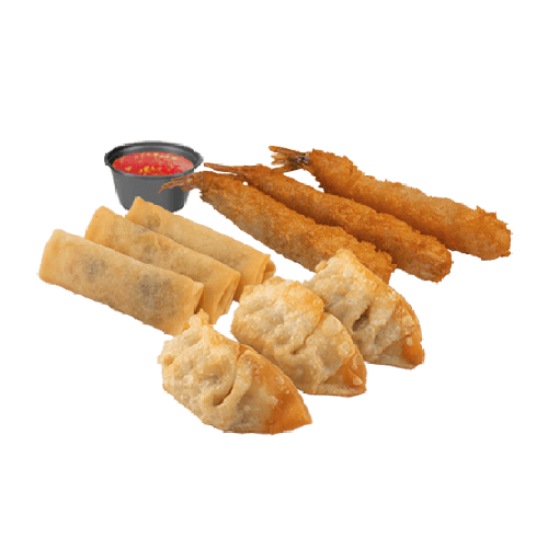 (9 st.) 3 Fried Chicken Mandu · 3 Ebi Fry · 3 Mini Spring Roll met bakje zoete chilisaus